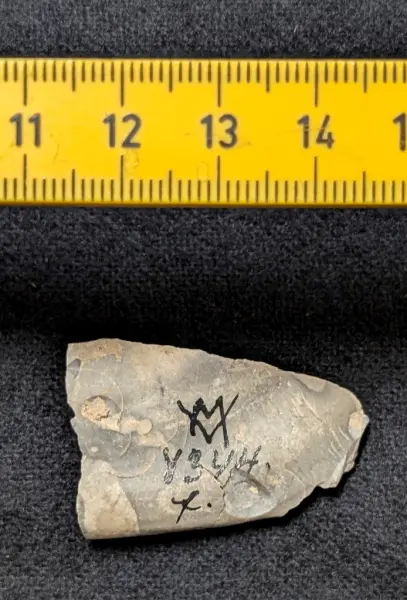 04 344:a-g. Fynd från Lerholmen, Hästefjorden, Frändefors socken. Dalsland. Gåva år 1910 av Thure Langer. f. Slipat flintredskap, fragment, 1 st. Ingår i en samling boplatsfynd VM04344 tillsammans med: a. Keramik, ornerad, 2 st. (Gropkeramik). b. Kölskrapa, 1 st. L. 6,2 cm. Bredd 2,6 cm. c. Mejsel, flinta, fragment, 1 st. Endast eggpartiet bevarat. Oslipat. L. 4,5 cm. Bredd 3 cm. d. Kärna, flinta, 1 st, av brun flinta. e. Skivskrapa, 1 st. Gjord av ett flintspån. g. Mikrolit, 1 st. Mikrospån, 1 st. Flintspån, obearb. 15 st. Flintstycke med bearb., 1 st. Flintavslag, obearb. 15 st. Flinta övrig. 1st (2st i låda) Skafthålsyxa. 1st