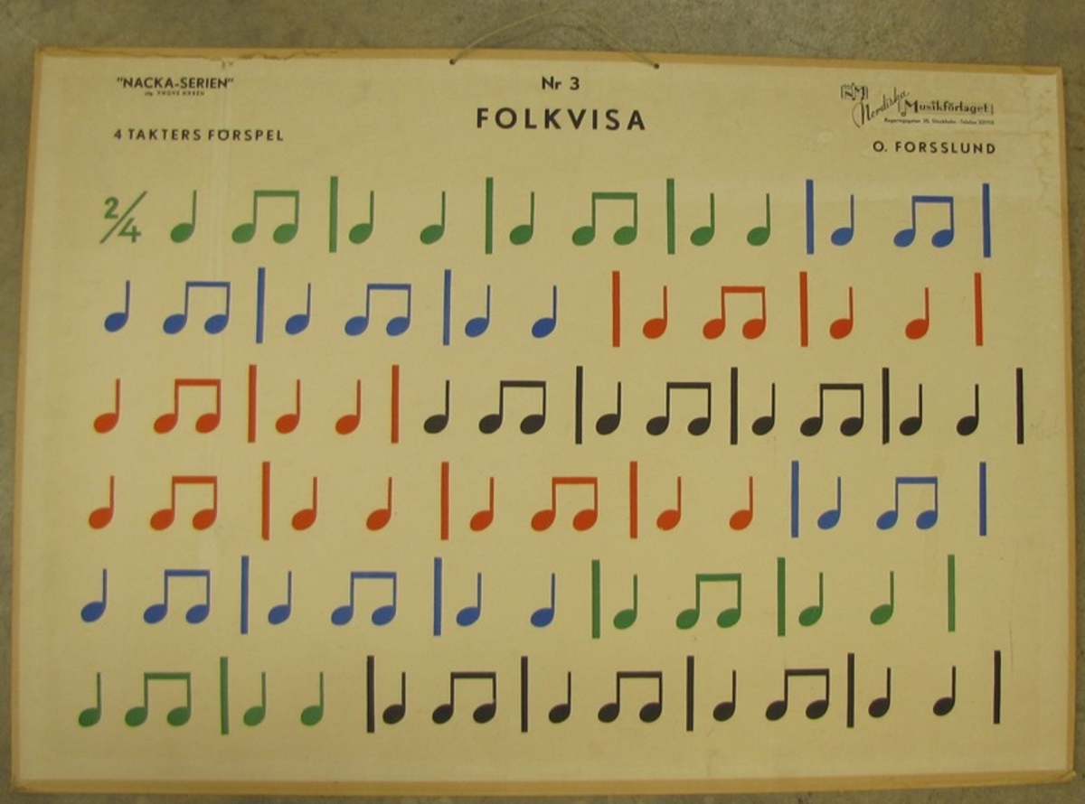 Noterna är färgade i rött och blått, svart och grönt. Skolplanscher med motiv: Musiklära (noter).