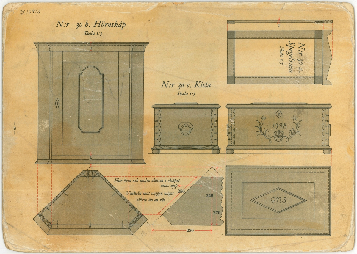 • Plansch med ritning av ett hörnskåp, en kista och en spegelram.