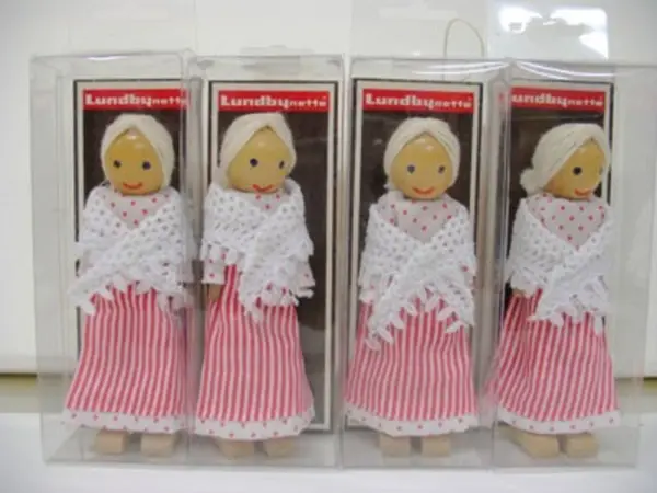 Docka ''Lundbynette'', 4 st. av trä med rörliga armar och ben. Handmålade ansikten med röd, glad mun och blå prickar till ögon. Vitt hår med knut i nacken, vitröd-randig kjol, vit blus med röda små prickar och vit sjal. Dockorna som är tillverkade för att ingå i dockskåp, är paketerade i lådor av plast och papp. Se 21 586:17:01-07.