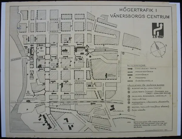 Översiktsplan över Vänserborgs centrum inför omläggningen till högertrafiken. På kartan finns inritat enkelriktade gator, kvartersvis, parkeringsförbud, stoppförbud, parkeringar samt övergångsställen.