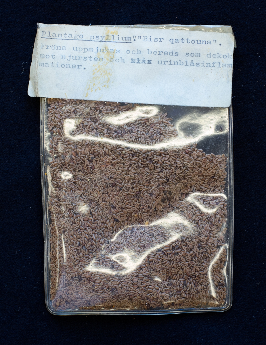 • Plastpåse innehållande frön. På påsen finns en klisterlapp med maskinskriven text: