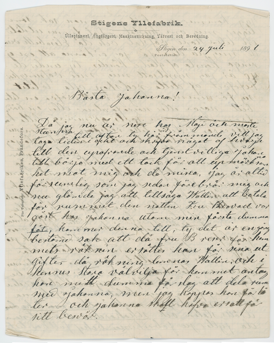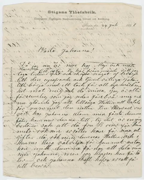 • Brev skrivet till Johanna Brunsson från Maria Andersson på Stigen 24/7 1891.