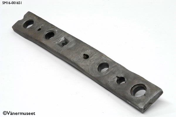 Nageljärn, funktion: smide. Rektangulärt järn, avbrutet i ena kortänden. Åtta hål olikformade för tillverkning av bult och skruv, med och utan försänkning. 1981 05 12. Behandlat med anitrol, penslad med dinitrol.