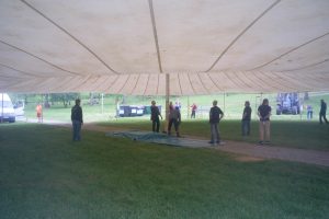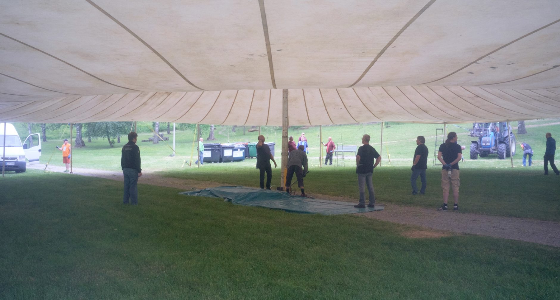 In the audio you can hear the volunteer workers using a manual winch to lift up the main tent. It is a hard job where one can’t use mechanical aid. One or two workers have to go under the tent canvas and use the winch by hand to lift the canvas.
