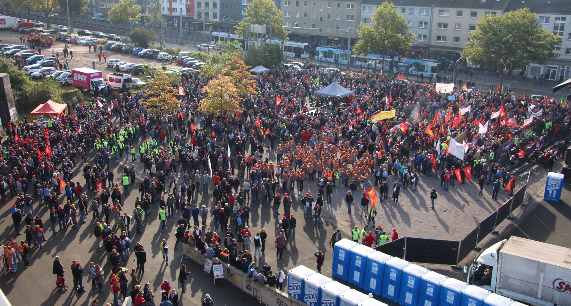 In September 2017 the Thyssenkrupp AG announced their plans for a fusion with the Indian steel cooperation Tata. The employees, the works council and the workers’ union IG Metall feared that Thyssenkrupp would close further steel works in Germany and dismiss employees. As a result, 7000 metal workers from all over Germany joined for a protest march and rally against the fusion of the two steel companies in Bochum. In this recording you can hear the welcoming words at the rally. You can hear people cheer, blow their whistles and electric sirens and horns. The recording was made from a hill above the venue. In the background the traffic and trams of Bochum are audible.