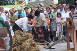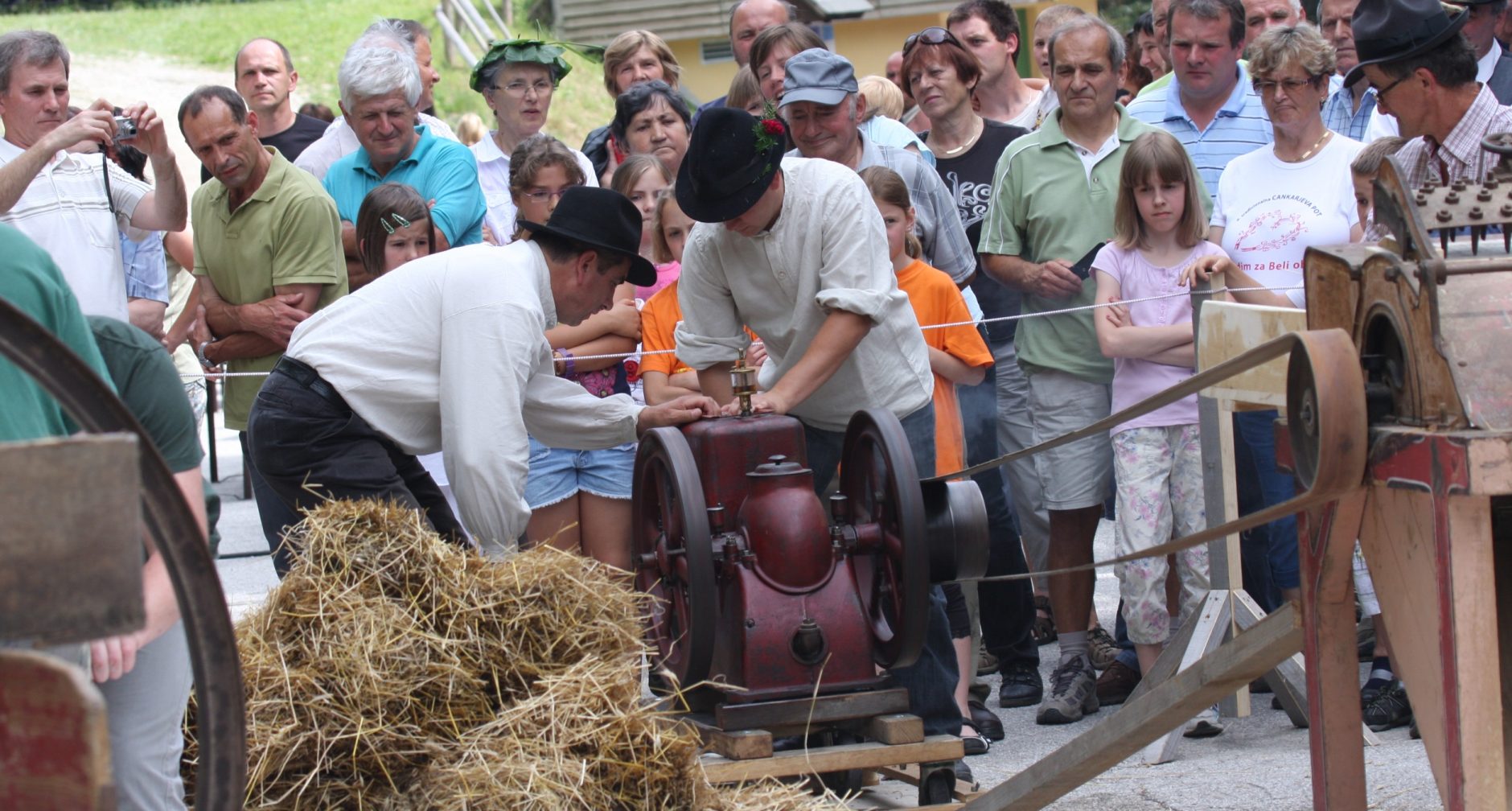 Hand-powered threshers were in use in Babno Polje and Bloke already before the First World War, and their use additionally spread between the two wars. The locals bought used 'capstan threshers' in the Gorenjska region where electrically powered threshers began to be introduced. Where there was an electric power system, petrol engines were replaced by electric motors. Other than the sound generated by the hand-powered thresher, the rustling of straw can also be heard in the recording.