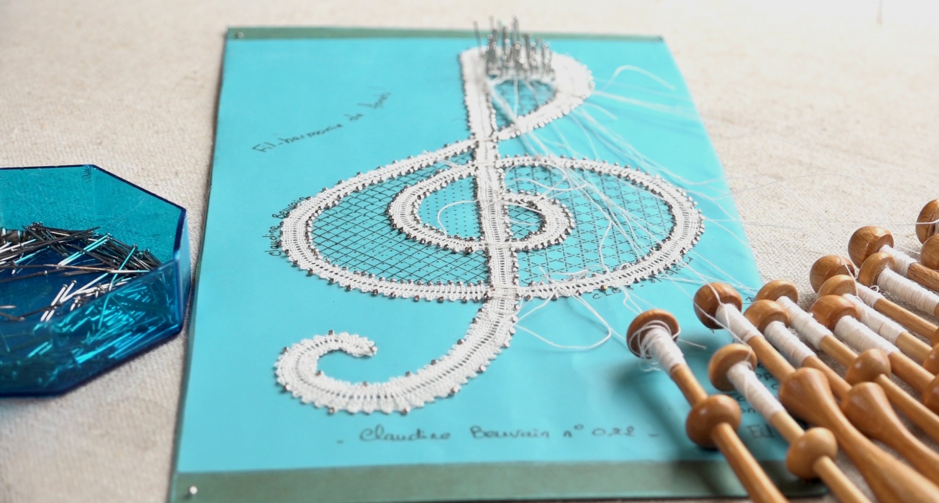 Pins are pushed down on the pillow. Lace is an openwork fabric, patterned with open holes in the work, made by machine or by hand. Lace is often made with cotton thread, although linen and silk threads are still available. Lace is typical of Belgium, where every city has its own stich. The sounds were taken in December 2014 in the Museum of La Fonderie. Claudine has created lace as a hobby for mo...