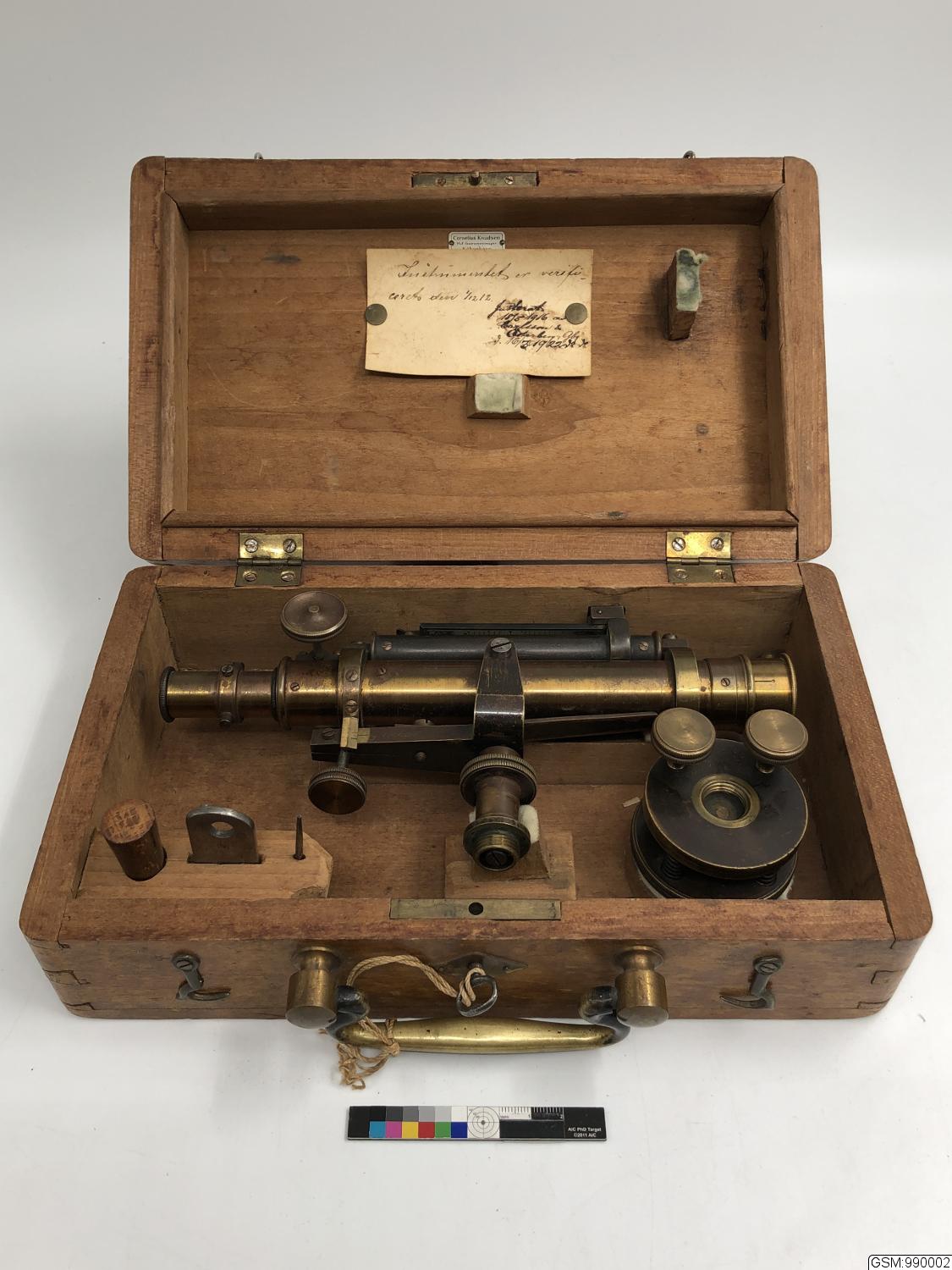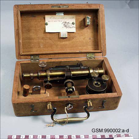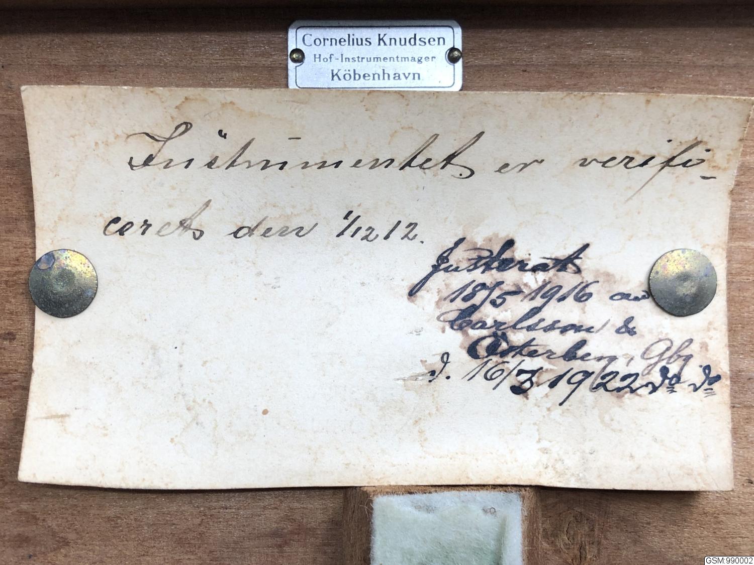 inköptes 1912 till Göteborgs Museum, Arkeologiska afdelningen av Georg Sarauw; leveranssedel daterad 7/12 1912, mottaget kvitterat den 12/12 1912; order per den 14 november per ilgods via Helsingör, Helsingborg från leverantören i Köpenhamn. Instrumentet renoverades och justerades 1916 för kr 5 av Instrumentmakare Carlsson & Österberg, Kungsgatan 1, Göteborg