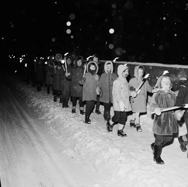 • "Scouter och söndagsskolebarn med facklor från Odinslund", Uppsala 1958