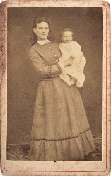• Porträttfotografi föreställande Kerstin Jönsdotter med sonen Ludvig Bring i famnen. Uppfäst på kartong med fotografens namn på baksidan.