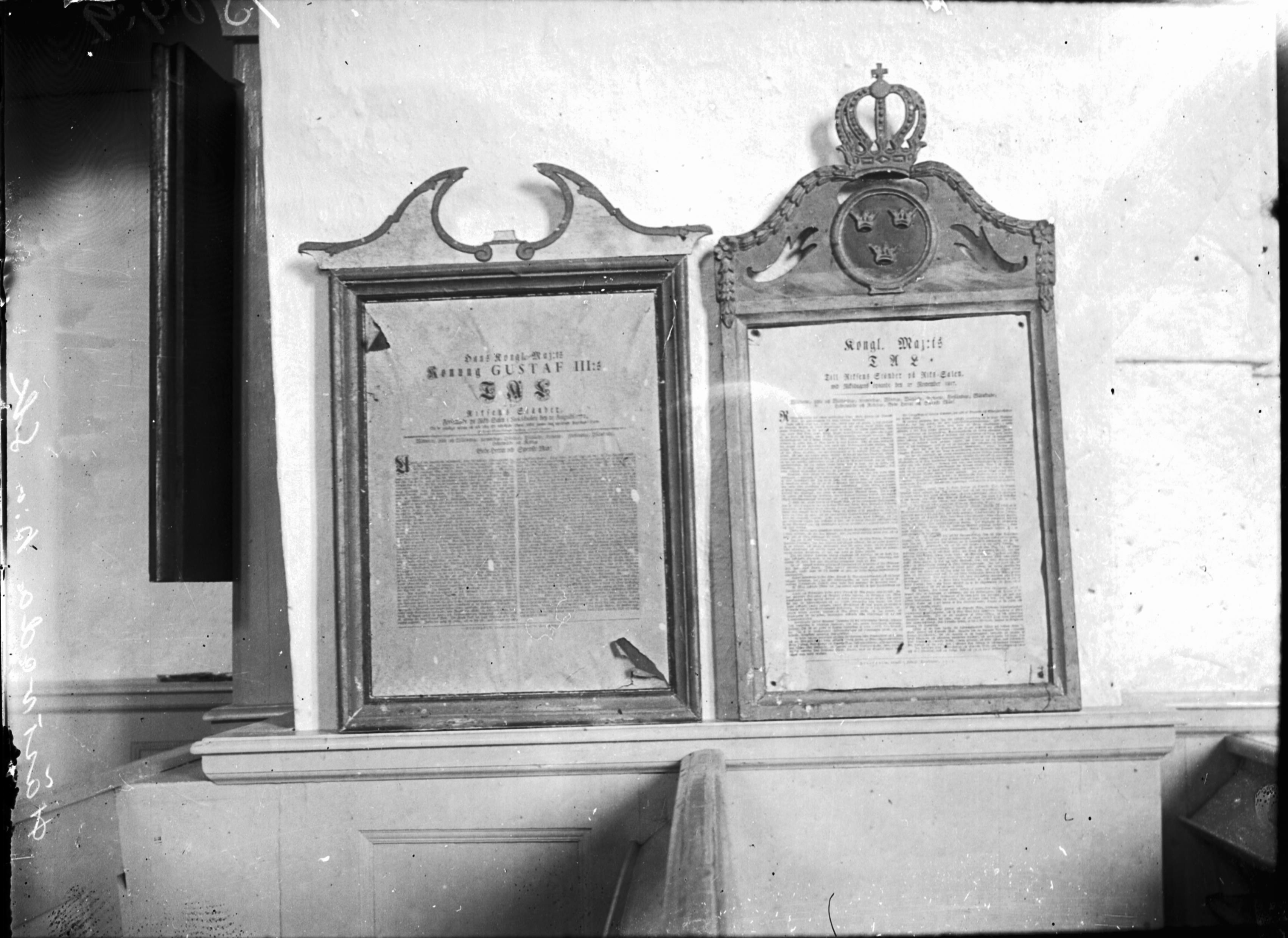 Gustaf III:s tal, enkel gul ramlist, utan glas, 1810. Karl XIII:s tal krönt med tre kronor, kungakrona, ramen polykromerad, 1817. Snabbinv.