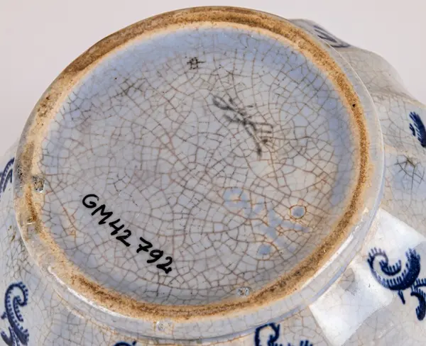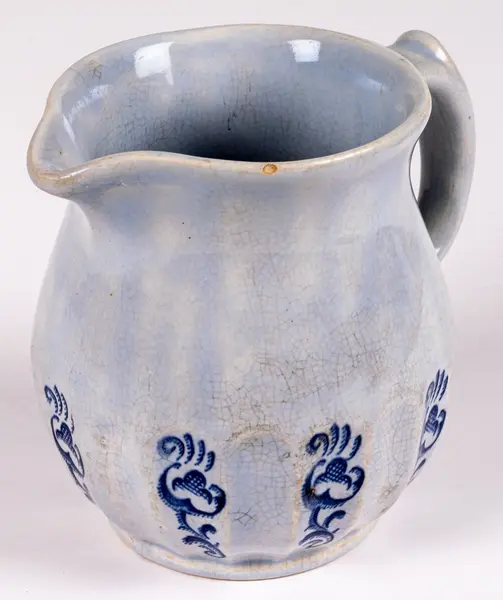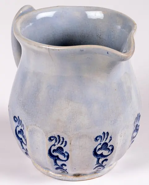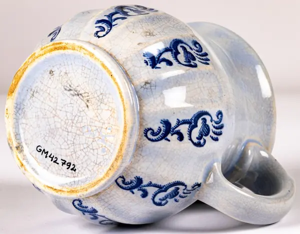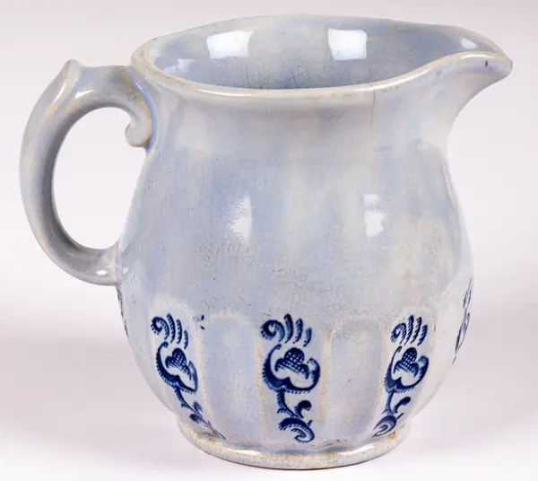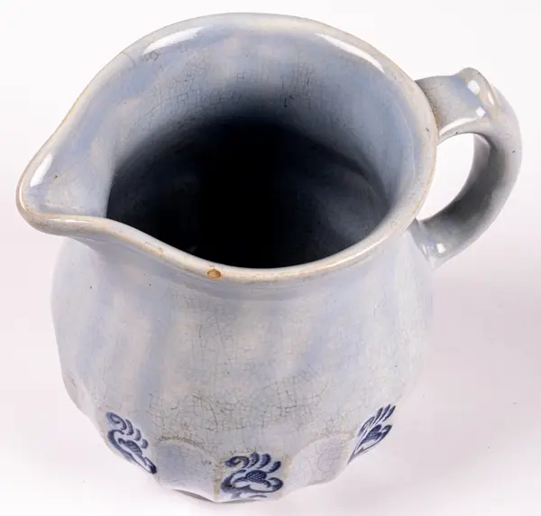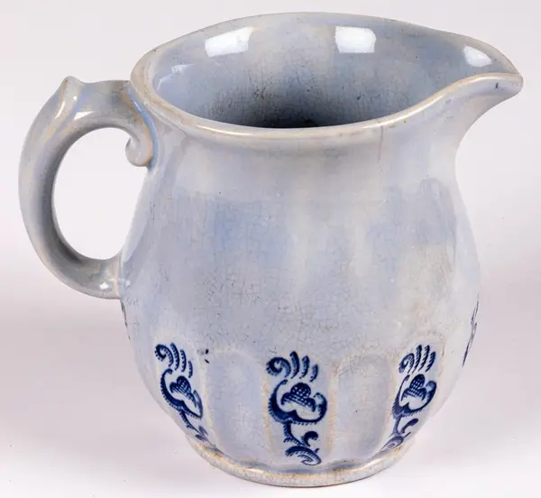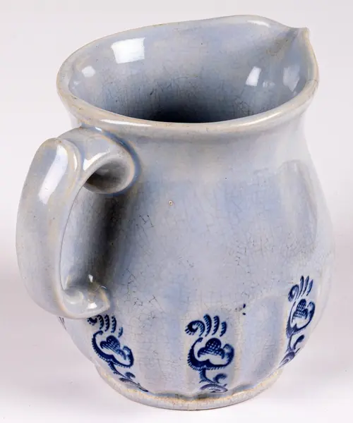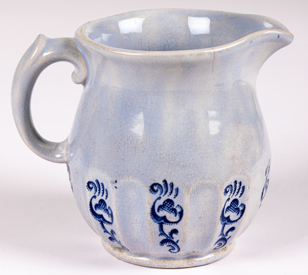 Liten tillbringare från Gefle Porslin, modell K, dekor Ingeborg, storlek 2. Den rymmer 0,5 liter. Ljust blå glasyr med hänkel och godronnering nedtill. I varannan godronnering tryckt dekor i blått i form av stiliserad växt eller blomma.