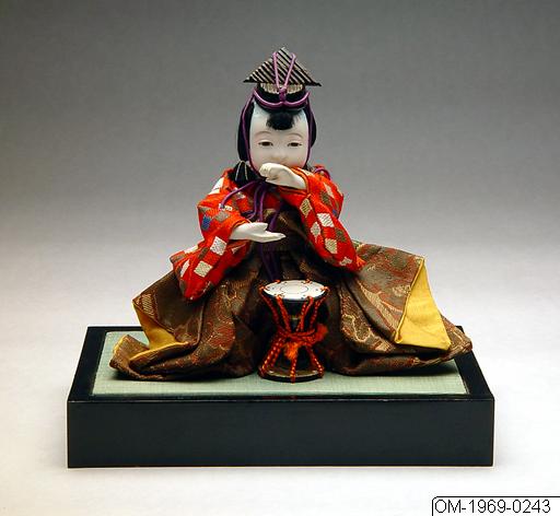 Sittande pojke med lös trumma 15 st. dockor föreställande olika yrkeskategorier. Tillhörande podier och mindre föremål. Kroppen tillverkad i gips (eller något plastliknande) och är bemålad Gåva av fru Stephanie Giesecke 1969. Enligt. förvärvskat. ska dessa ha nr. OM-1969-0235-0266, men de har ingen synlig märkning. Höjd ca. 18 cm inkl. podium Från textilmag