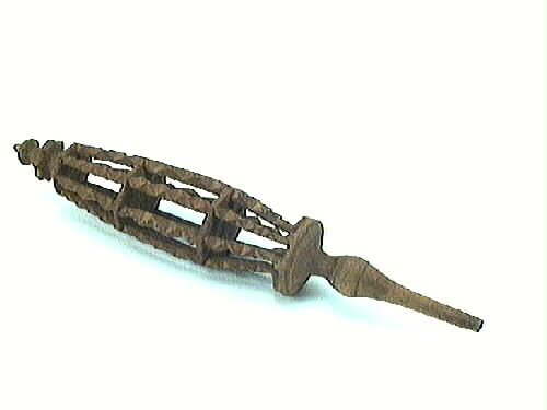 Linfäste skuret i trä med svarvad lång spets. Rikt utskuret med åtta fristående stolpar. Två åttakantiga, sex mm tjocka, lätt konvexa plattor bildar tre fack, de två yttre 57 mm långa och det i mitten 65 mm långt. Båda är skurna. Stolparnas ena ändar är formade som fötter, mot den svarvade änden. Avsmalnande stolpar från mitten. Svarvade änden är 142 mm, lång, konvex form med avsmalnande ände till...