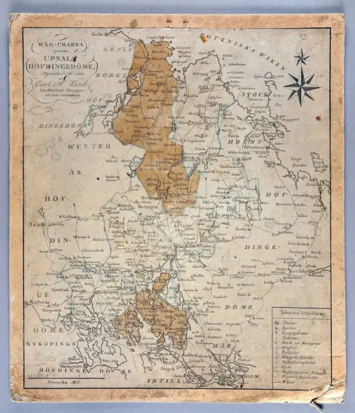 Tryckt karta, delvis färglagd i gulbrunt. "WÄG-CHARTA genom UPSALA HÖFDINGEDÖME. Uprättad År 1801 af Carl H. Bäck. Landtmäterie Directeur och Ordin. Landtmätare". Kartan är monterad på papp. På baksidan rester av upphängningsanordning.