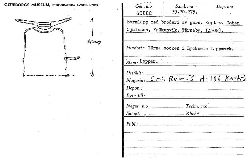 • - - Gen. n:o 63222 Dep. n:o - 39.70.275. GOTEBORGS MUSEUM, ETNOGRAFISKA AVDELNINGEN Barmlapp med broderi av garn. Köpt av Johan Sjulsson, Fräkenvik, Tärnaby. (4308). Fyndort:- ..Tärna..socken-- -i --L... Visa hela