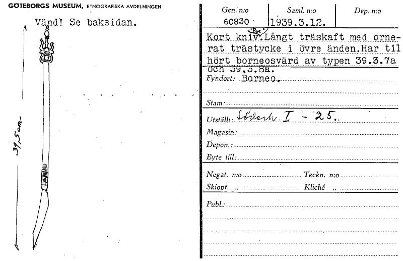 • GOTEBORGS MUSEUM, ETNOGRAFISKA AVDELNINGEN Gen. n:o Saml. n:o Dep. n:o 60830 1939.3.12. Kort knIKAngt träskaft med orne- rat trästycke i övre änden.Har til hört borneosvärd av typen 39.3.7a och 39.3.8... Visa hela