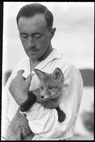 - 'Bildtext: ''En av rävungarna (se fotonr. 5167:8).'' 1 ma hållande 1 rävunge i famnen, närbild. :: :: Ingår i serie med fotonr. 5168:1-8, numrerade med bildnr 239-246. Se även hela serien med fotonr. 5155-5174.'