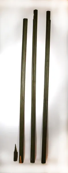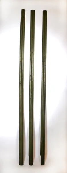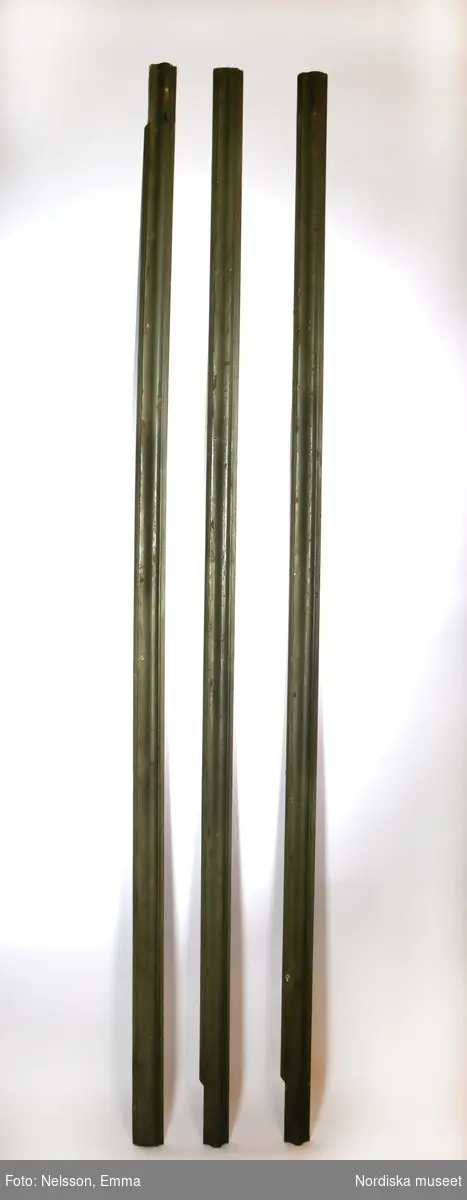 • Fönsterfoder, 6 st (2+2+2), av furu, med kraftigt profilerad vulst, målat i grågrön oljefärg, omkring 1740. Krok upptill.