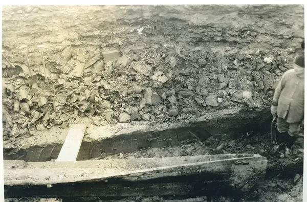Arbetsbild från utgrävningen av båtfyndet i Gamla hamnen i Västerås, 1935."Kölen tages upp".