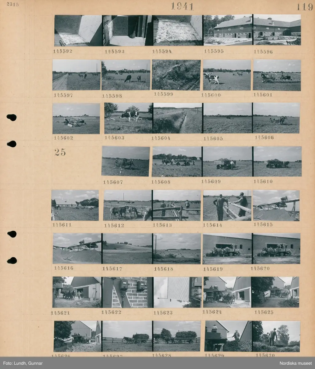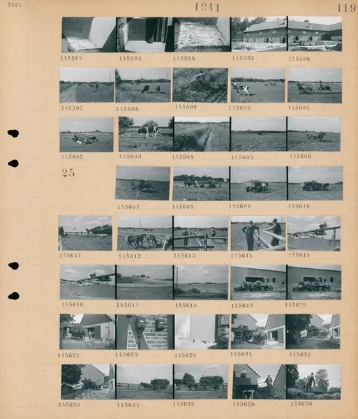 Motiv: (ingen anteckning) ; Flugor på ett golv, exteriör av en ladugård, landskapsvy med hästar på en äng, landskapsvy med kor på en åker, en traktordragen slåttermaskin, ett hästdraget jordbruksredskap. Motiv: (ingen anteckning) ; Män lastar en hästdragen vagn med hö, hästar i en hage vid ett hus, två män står vid ett staket med hästar i bakgrunden, en man skjuter en vagn på ett spår, landskapsvy med åkrar med höhässjor, en hästdragen vagn lastad med hö på en gårdsplan, strömbrytare på en husvägg, människor lastar av hö.
