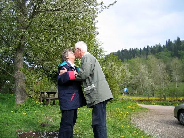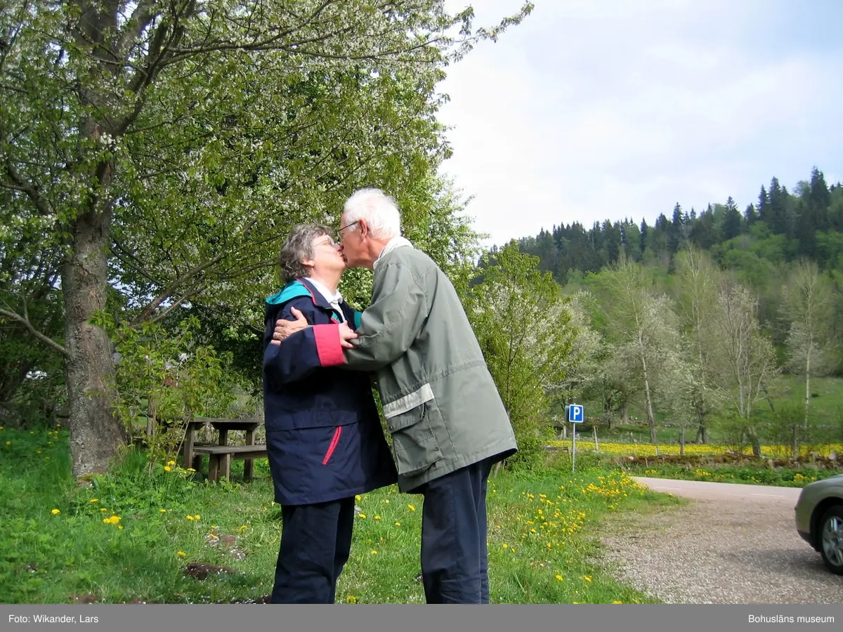 Ur e-brev från Lars Wikander till Bohusläns museum, 20180214: "Hej! Hustrun och jag ska besöka Kungälv framöver. I planeringen passade jag på att besöka muséets hemsida för att spana in pågående utställningar. Och av en slump, som så ofta förr, får jag se Pussupprop. Inga foton som visar kyss eller puss? Bland mina 30 000 foton i datorns arkiv kommer jag direkt att tänka på det jag har. Det togs 2005. Hustrun Birgitta och jag gjorde en tur i norra Västergötland. Vid Billingens västra sluttning ligger Körsbärsdalen. Det triggade genast min alerta associationsförmåga. Kyssbärsdalen! Följden blev parkering, montera upp kameran, aktivera självknäpparen, upprop till Hustrun att ställa upp för puss - och KLICK! Resultatet bifogas. Bakom pussen 2005 fanns 44 års äktenskap. Ytterligare 13 år har gått så nu har vi varit gifta i 57 år. Upprinnelsen är smått ofattbar och extra ordinär så jag kan lika gärna bjuda på den också. I mitten av 50-talet hade jag lämnat läroverket i Borås. Halvåret senare ringde en skolföreningen som jag varit medlem i. De frågade om jag kunde agera tomte på deras julfest. Visst! Eftersom det hela är preskriberat med god marginal kan jag nu för första gången berätta den hemska sanningen om hur jag gick tillväga. Och det är INTE lämpat för kopiering! Iförd min fars gamla röda morgonrock, tomtemask och RULLSKRIDSKOR körde jag fars gamla Chevrolet, via en runda kring Stora Torget i Borås, till lokalen för julfesten. Parkerade, tog mig försiktigt ner för halvtrappan till källarvåningen, grep säcken med julklappar på avtalad plats och knackade på dörren. Öppnade med frågan Finns det nåra snälla barn här? och rullade in. Fånade mig med några skrinn på rullskridskorna och drattade sen på ändan till publikens jubel. Julklapparna delade ut, jag demaskerade mig, tog av rullskridskorna och bjöds att sitta med och äta julgröten. Det var då jag fick se en flicka på andra sidan grannbordet. Jag har aldrig lekt med känslor eller varit nån flickjägare, men mina blickar tog hela tiden returer dit. När festen var slut undrade jag, som jag brukade, om det var några som bodde långt bort och ville ha skjuts hem. Tre anmälde sig, dock inte Hon. Av någon anledning frågade jag henne om hon ville åka med på den hemkörarrundan och av någon anledning svarade hon ja. Ute vid bilen såg jag till att de tre satte sig i baksätet och att Hon, Birgitta, kom att sitta bredvid förarsätet. När de tre var avlämnade skulle jag köra Birgitta hem. Det visade sig att hon bodde bara två kvarter från julfestens lokal. Strax före stannade jag och parkerade i en kurva. Sedan finns det två versioner av vad som hände. Min version var att Birgitta la armen om min hals och vi kysstes. Hennes version är att jag lade armen om hennes hals och vi kysstes. Jag fattar inte varför, men våra barn håller på hennes version. Å andra sidan spelar det ju ingen som helst roll, utöver äran, för resultatet blev detsamma. Vi var kära och höll ihop i nära två år. Då beslutade vi, inte att göra slut, men att göra ett uppehåll. Ingen fnurra på tråden, ingen tredje part inblandad. Ingen av oss minns i dag orsaken eller motiveringen. Vi hade ingen kontakt under åren som gick, men hösten 1959 hände något. Jag studerade i Göteborg. En dag städade jag skrivbordslådorna och längts in i en av dem hittade jag foto på Birgitta. Det hände så pass mycket att jag tog och la kortet i plånboken. Och tittade på det då och då. Minns att jag också en kväll visade min rumskompis fotot och berättade bakgrunden. I februari 1960 kom ett överraskande brev från Birgitta som då studerade i Lund. Hon skrev att hon under en tid tänkt på mig och bara undrade hur jag hade det. Vi hade alltså på var sitt håll av någon okänd anledning börjat tänka på varann igen. Mitt första brevsvar började med Kära Birgitta! Mitt andra med Älskade Birgitta! Två månader senare besökte jag henne för första gången nere i Lund och hade IKEAs möbelkatalog med mig som det naturligaste i välden! I augusti 1960 förlovade vi oss. Midsommar 1961 gifte vi oss och det är 2018 alltså 57 år, två barn och fyra barnbarn sen. (Se foto) Och Hon, Birgitta, Hustrun, livskamraten, blev högsta vinsten i mitt livs lotteri. Och avslutningsvis kan jag med västgötaskalden Wilhelm von Brauns ord säga att Hon fortfarande kan få min puls att gå i trav. Hälsningar Lars Wikander författare Borås"