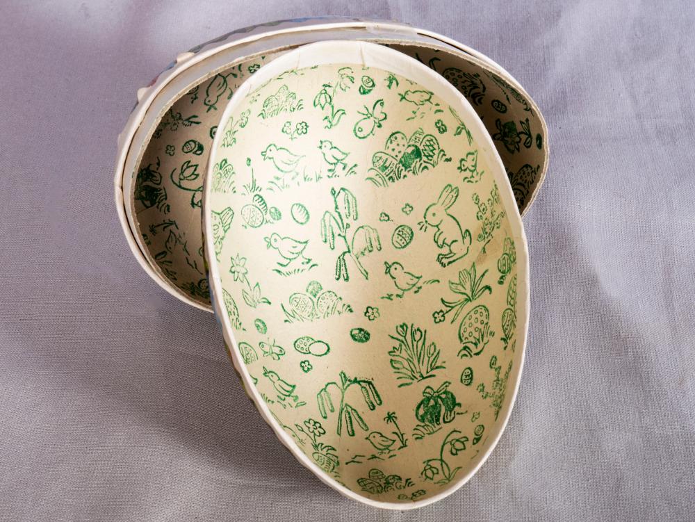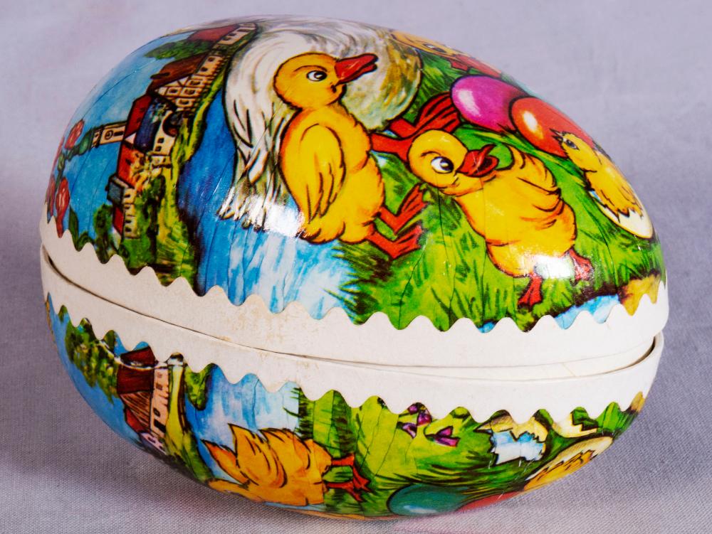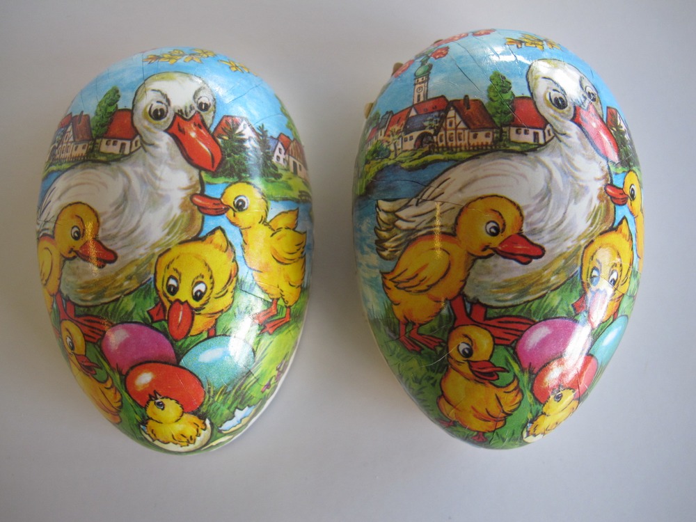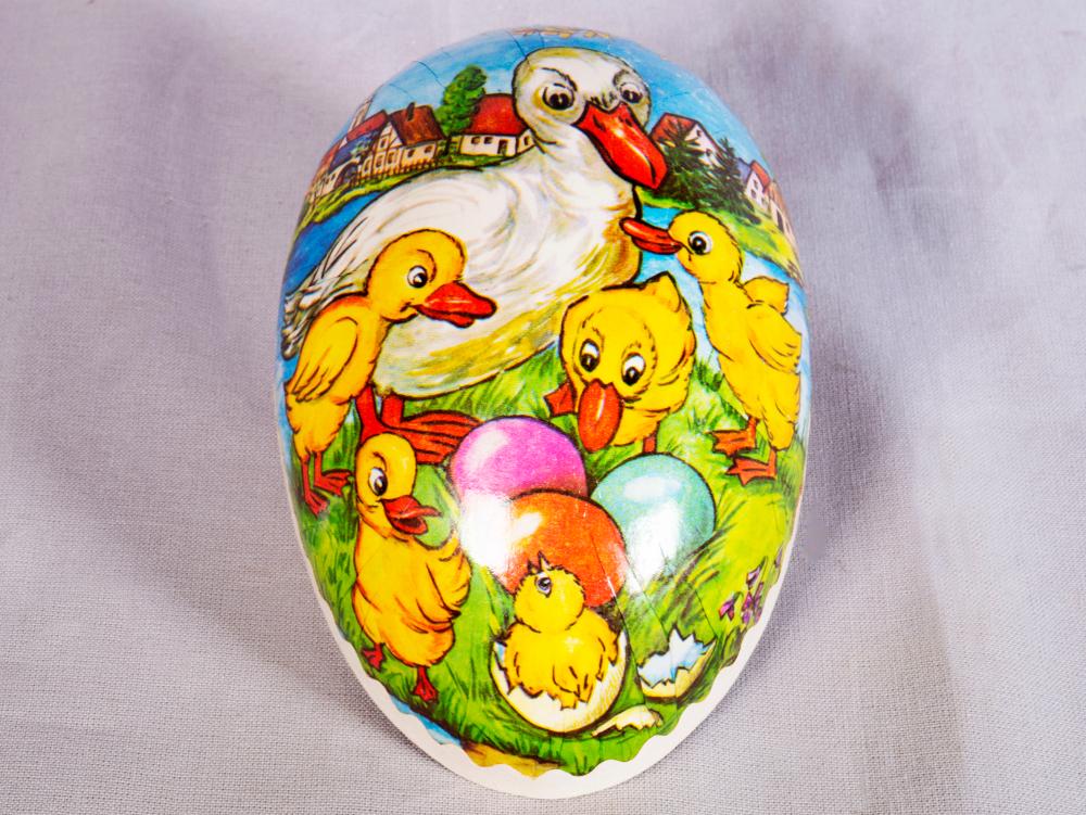 • Påskägg i två delar klätt i papp. Tryckt motiv, samma på båda sidor, föreställande en ankmamma med ungar.