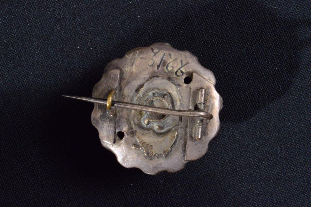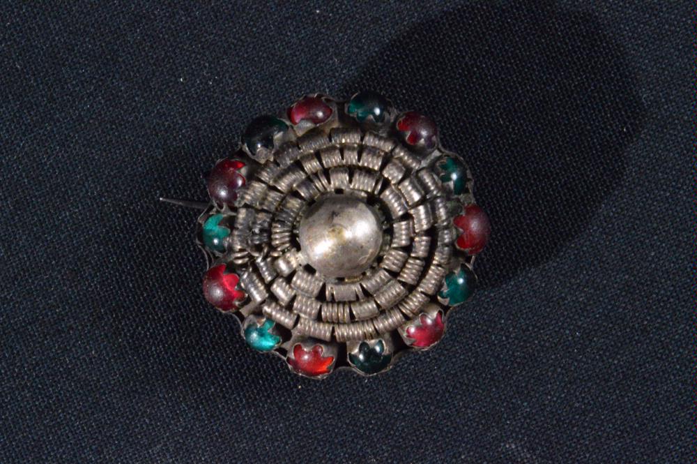 • Knapp av silver omändrad till brosch. Filigran, med krans av stenar, varannan röd varannan grön