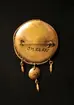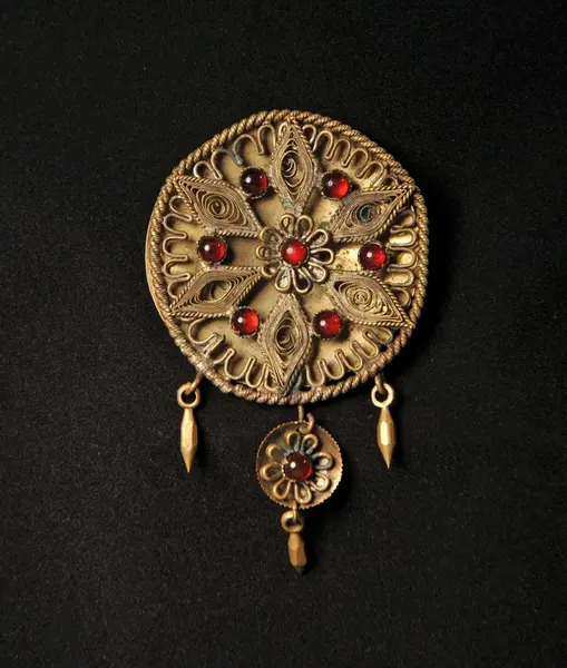 En rund brosch av mässing med mönster i filigran i form av en sexuddig stjärna prydd med 7 röda glasstenar. Nederst tre hängen, i mitten en rund skål med infattad röd glassten. Troligen utländsk tillverkning.