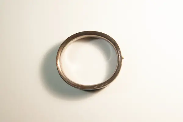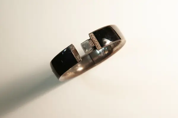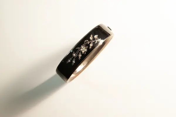 • En st. stel armring av silver med svart emalj. Graverad blomdekor med infattade små pärlor. Troligen utländsk tillverkning (England eller Frankrike).