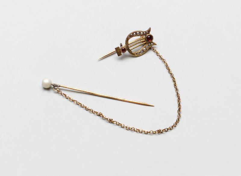 Brosch av guld i form av lyra besatt med 14 pärlor och två röda stenar; vidhängande kedja av runda länkar avslutad med en nål med en pärla till huvud. Mått: Broschens l 1,75 med nål 2,6 cm. Kedjans l 11,5 cm. Nålens l 4,8 cm.