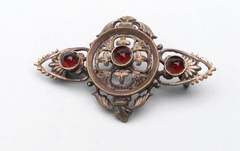 Brosch av gulmetall med spår av försilvring, 3 röda stenar. Centralt en ring med genombrutet blommönster och en sten, flankerad av två hjärtformade stycken med genombrutet mönster och sten.