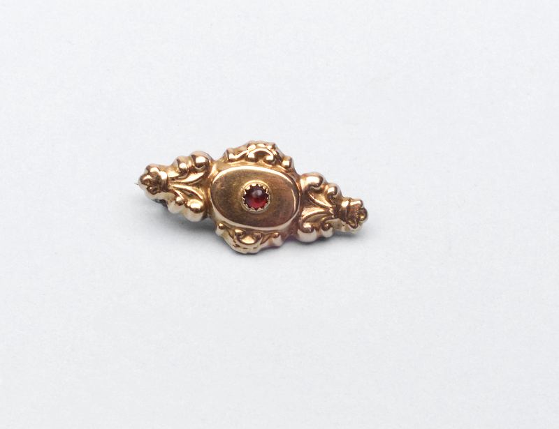 • Brosch av pressat guldbleck med röd sten. Liten oval omgiven med