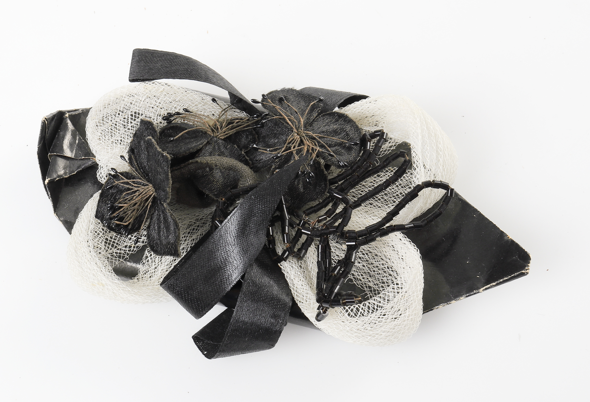 • Begravningskaramell med svart glanspapper, vit rosett av tyll, svarta band, pärlor och blommor.