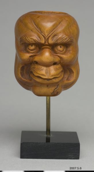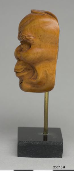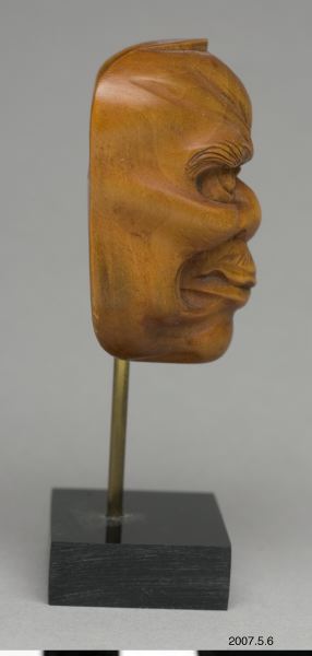 • Mask av karvat träpå stativ. Mask av No-typ.