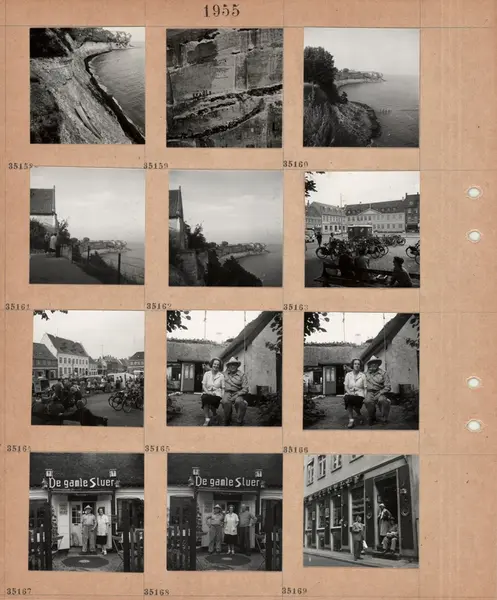 Landskapsvy med klippa och hav, vy över ett torg med parkerade cyklar, torghandel på ett torg, porträtt av en kvinna och en man som sitter på en gårdsplan, en man och en kvinna står vid ett hus med skylt "De gamle stuer" "Medbringt mad velset", en man - en kvinna och fotograf Gunnar Lundh står på trappan till ett hus med skylt "De gamle stuer", gatuvy med affärer.