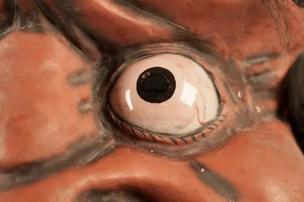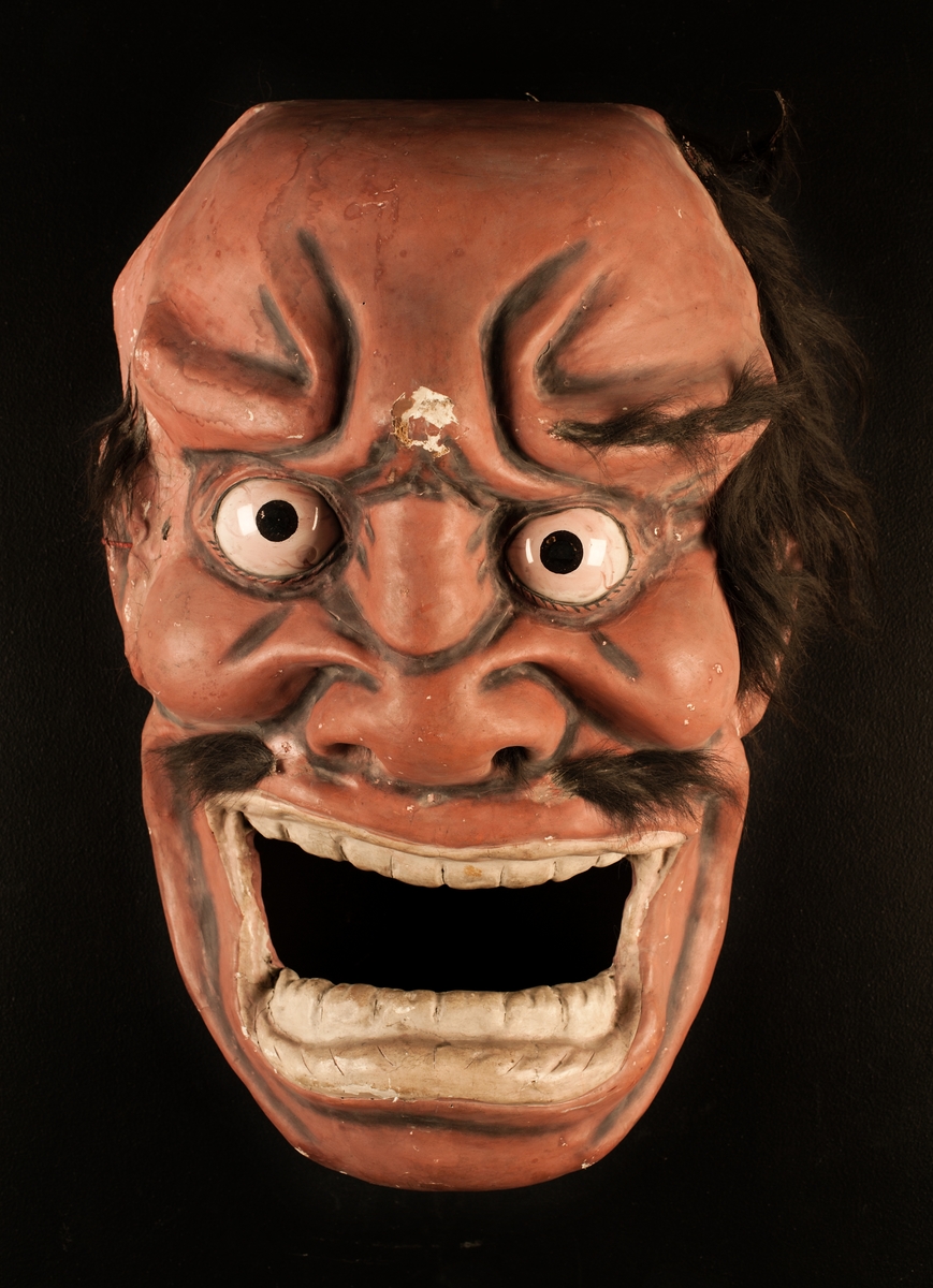 • Japansk mask, troligtvis en onimask, krederad och målad i vit, svart och rödbrun färg. Masken har vidöppet gap och stirrande porslinsögon. Peruk, ögonbryn och skägg är troligen tillverkade av människo... Visa hela