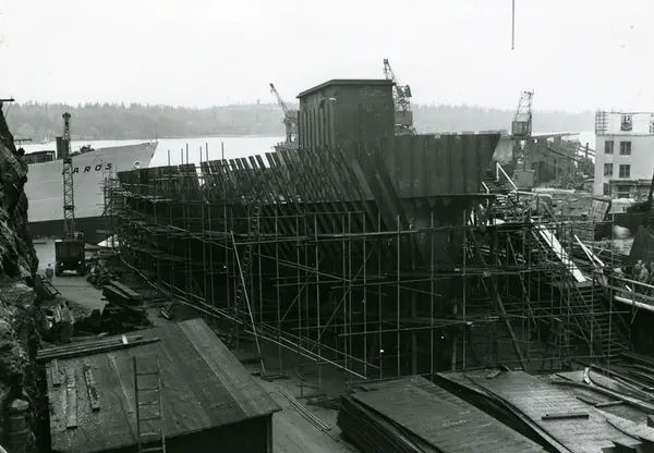 Foton från Finnboda varv.Fartygsskrov bygges på Finnboda Varv.