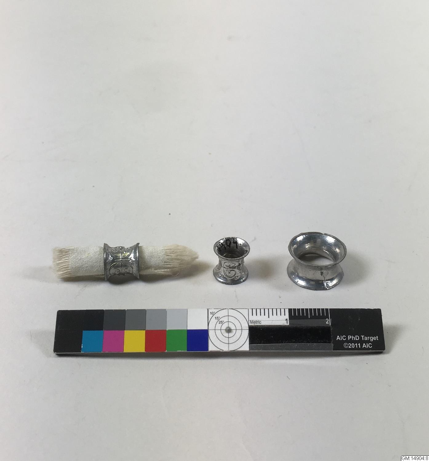• Servettringar, 3 st av tenn, för dockskåp. En större och två mindre. I en av de mindre sitter en liten rullad servett.