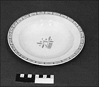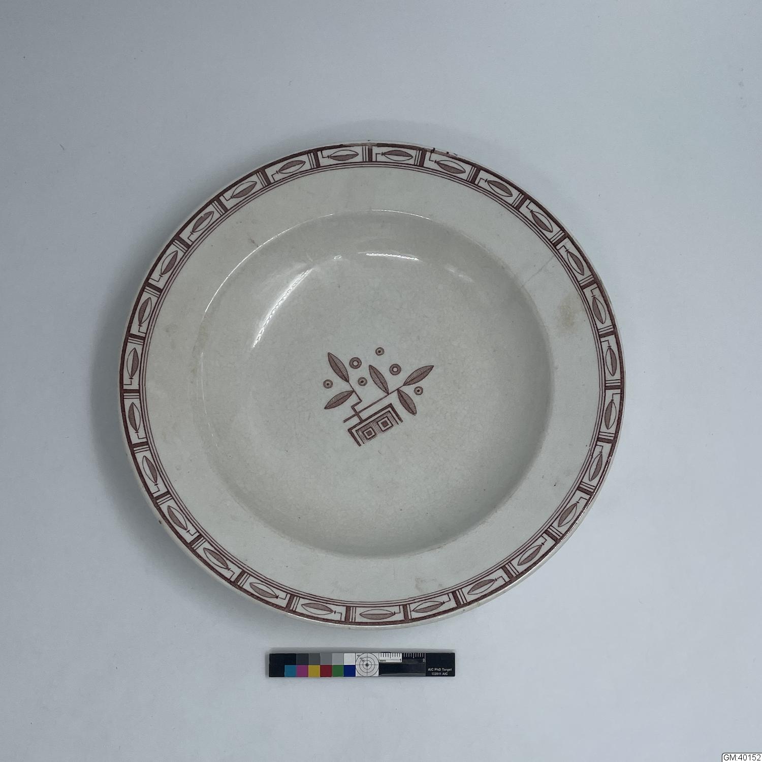 Desserttallrik, djup i vitt flintgods med brun dekor i koppartryck: dels i form av mittmotiv på spegeln, dels såsom kantbård på brättet. På undersidan märt "Tango, Rörstrand" i brunt samt med stämpling i godset: W Rörstrand 30 K 1. Krackelerad; en spricka i brättet. #Enl. Rörstrands museum har Gunnar Nylund svarat för servisens design.