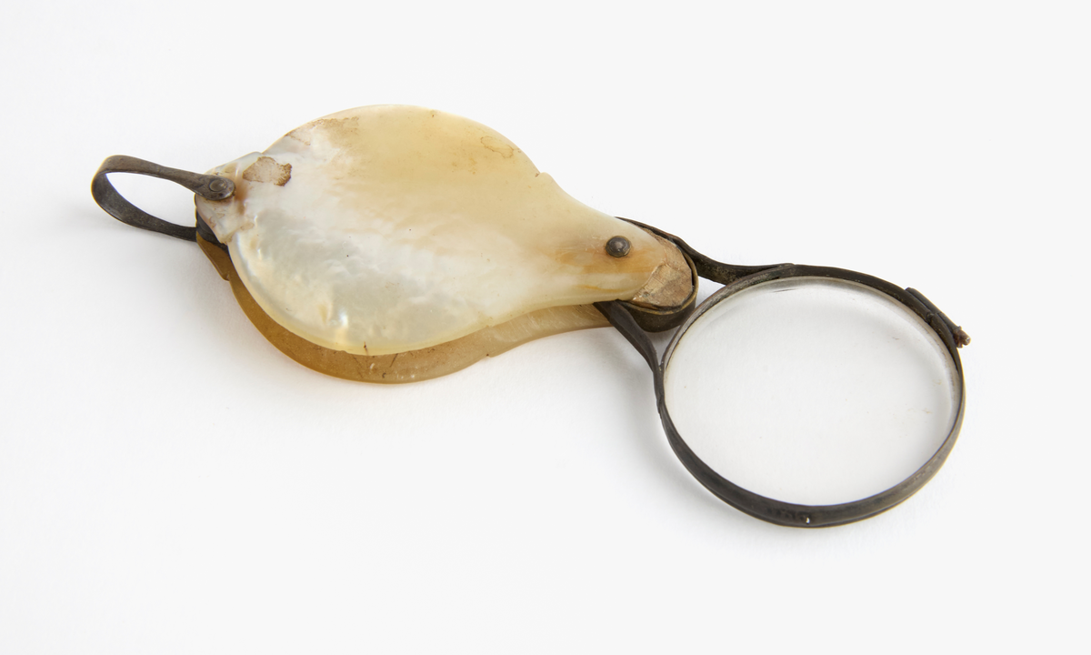 Lornjett från Husby. Synglas med pärlemorskaft. Utfällbart glas infattat i metallram. Fälls in i etui av pälemor.