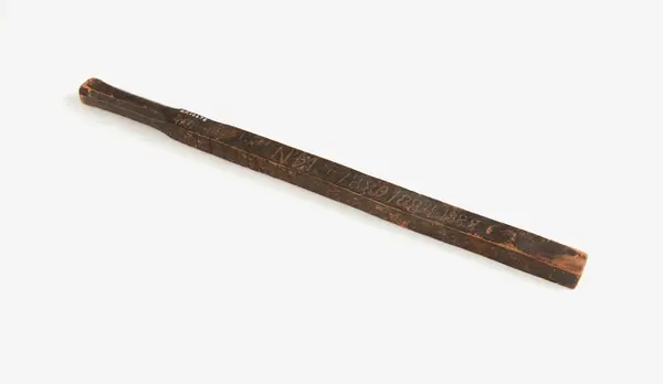• Fattigstav, tiggarstav. Från Myrbacka, Järna sn. Trä. Avsågad. Inskript: "1878, Den 18/7" + ett flertal årtal & bomärken.