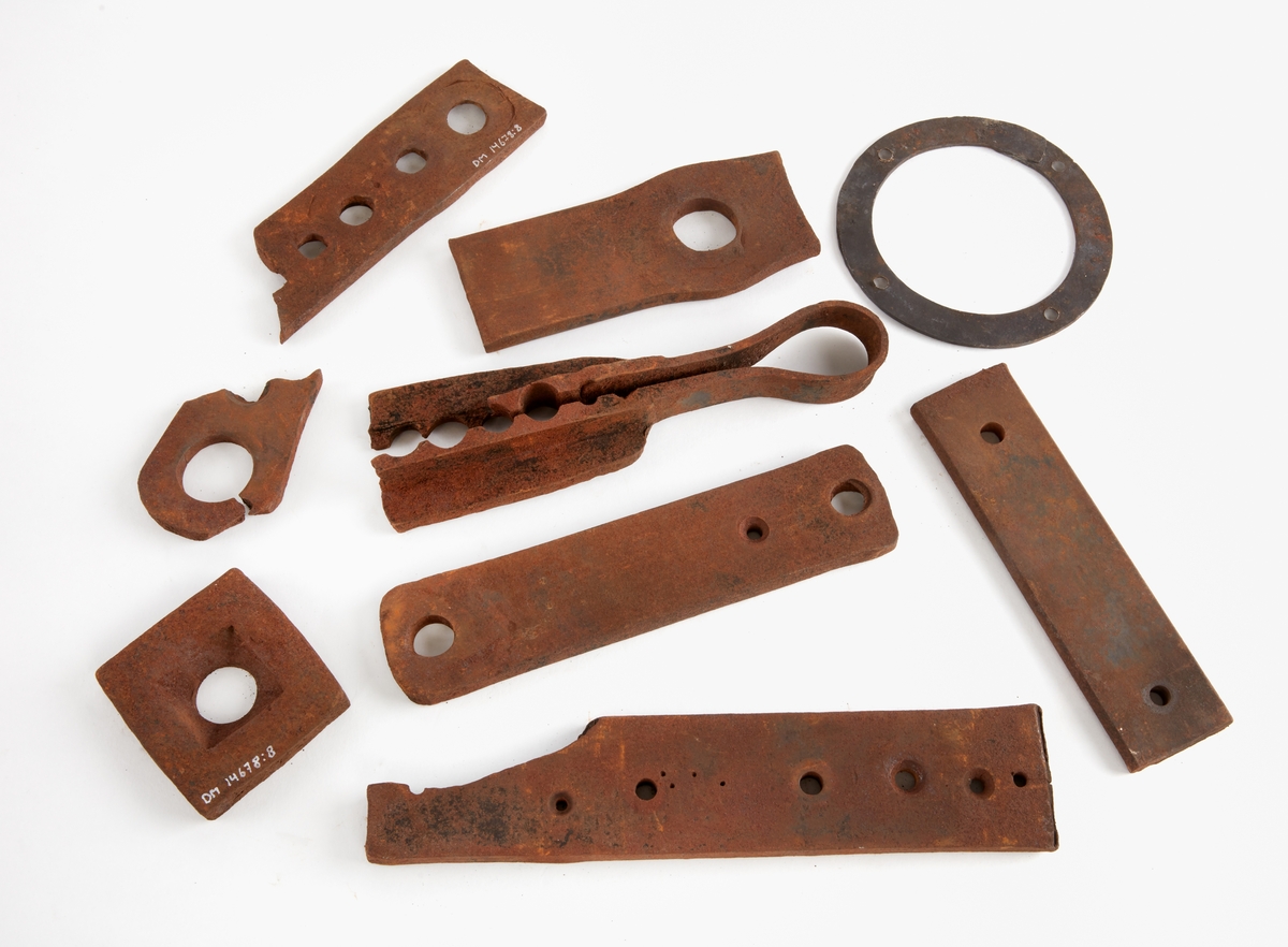 • Diverse redskap i smidesjärn, främst nageljärn och mallar för dragning av järntråd. Ett nageljärn spräckt på mitten.