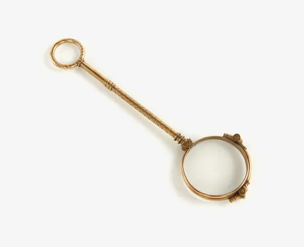 Lornjett. Runt dubbelt glas monterat i metallbåge. Smalt handtag som avslutas med ring.