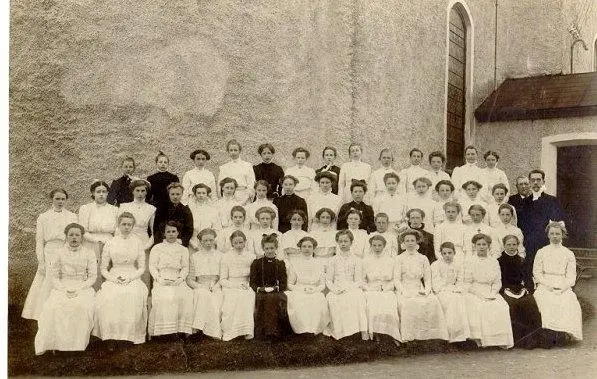 - Konfirmander 1913-14. Pastor Einar Rudberg. 1:a raden (nederst): 1. Andersson 2. Palm, 3. Leijon, 4. Larsson, 5. Ekblad, 6. Engström, 7. Moberg, 8 - 12. okända, 13. Hjärtman, 14. Gustavsson. 2:a raden: 1-2 okända, 3. Gustavsson, 4. Ekblad, 5, Gren, 6, okänd, 7. Hedström 8. Larsson, 9. Johansson, 10. Andersson. 3:e raden: 1. Fredriksson, 2. okänd, 3. Rythén, 4. Nilsson, 5. Holmkvist, 6. Petersson, 7. Setterberg, 8. Bergkvist, 9 H. Eriksson, 10. Fredriksson, 11. Liden, 12. Bergkvist, 13. Thunberg, 14. Setterberg. 15. Ahlin. 4:e raden: 1. Engström, 2. Andersson, 3. Höglund, 4. Johansson, 5. Persson 6. okänd, 7. Karlsson, 8 -11 okända. Namnuppgifter: Allan Bergström, Eriksgatan 27, Falköping.