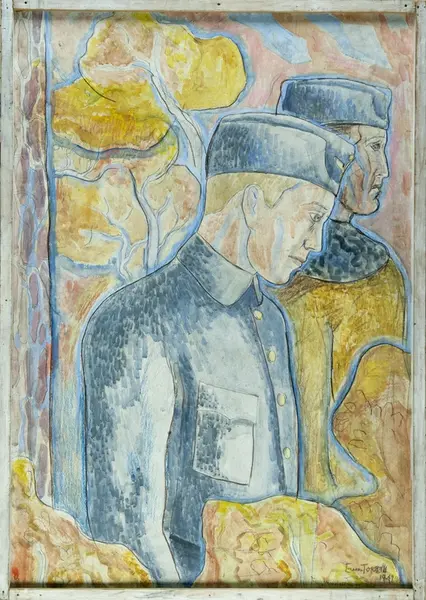 • Tavla av Einar Forseth, benämnd "Sörjande flygare".Tavlan är utförd i blandteknik av tusch, akvarell och möjligen krita på vitmålad träpannå i oglasad, vitmålad träram. Verket är en förstudie till For... Visa hela