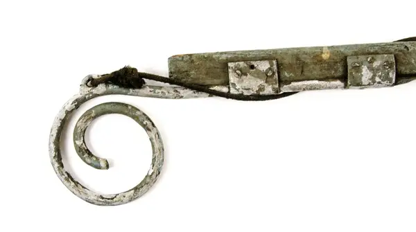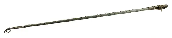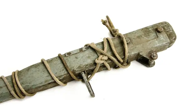 Uppfångningsanordning, anordning för att fånga upp rapporthylsor. I form av en gråfärgad trästång med en mindre "metkrok" av metall som är fäst i toppen. Med snöre.