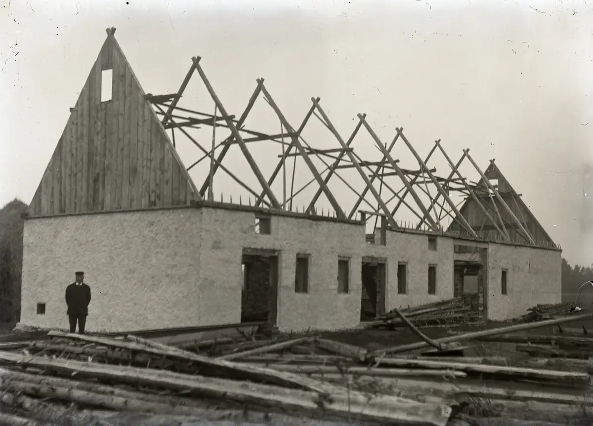 Dalbo Anton Jakobsson har byggt en ståtlig ladugård åt sig! Stolt står han vid gaveln! Det är två fähusdelar med en foderglugg i taksprånget hitåt och en laddel bortåt. På spärren, takstolarna, ser man att hanbalkarnas ändar sticker ut och att spärren korsar sig i toppen. I klykorna som bildas skall åsar läggas, vilka skall bära raftarna som agen skall vila mot. Väggarna är nu brukslagna. Man har ...