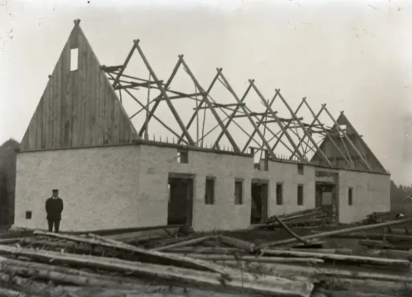 Dalbo Anton Jakobsson har byggt en ståtlig ladugård åt sig! Stolt står han vid gaveln! Det är två fähusdelar med en foderglugg i taksprånget hitåt och en laddel bortåt. På spärren, takstolarna, ser man att hanbalkarnas ändar sticker ut och att spärren korsar sig i toppen. I klykorna som bildas skall åsar läggas, vilka skall bära raftarna som agen skall vila mot. Väggarna är nu brukslagna. Man har kostat på fönster högst upp på gavlarna, vilka skall ge ljus till loftet även om det är fullt med hö. Se Nr 267.